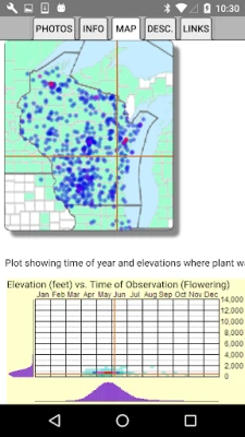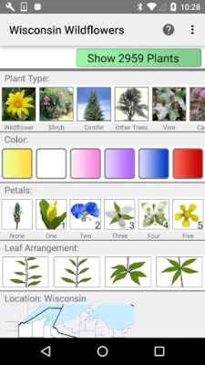 The App includes 3,091 species of plants found in Wisconsin. Overall, 1,470 are "Wildflowers", 232 are shrubs, 176 are broadleaf trees, 23 are conifers, 47 are vines, 489 are grass-like, 94 are fern-like, 334 are moss-like, and 321 are lichen.